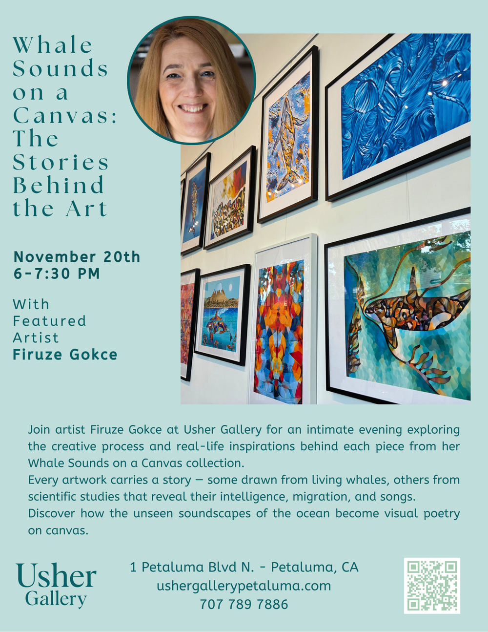 Join artist Firuze Gokce at Usher Gallery for an intimate evening exploring the creative process and real-life inspirations behind each piece from her Whale Sounds on a Canvas collection.